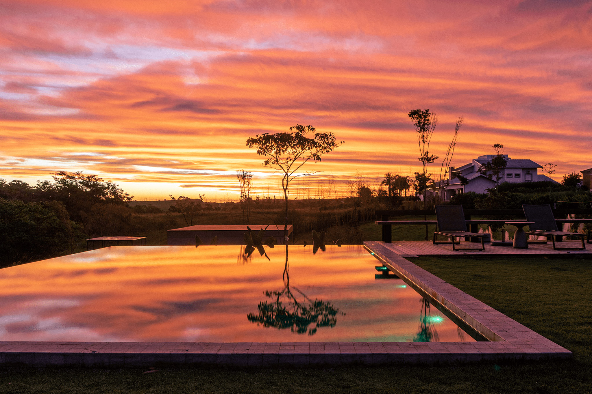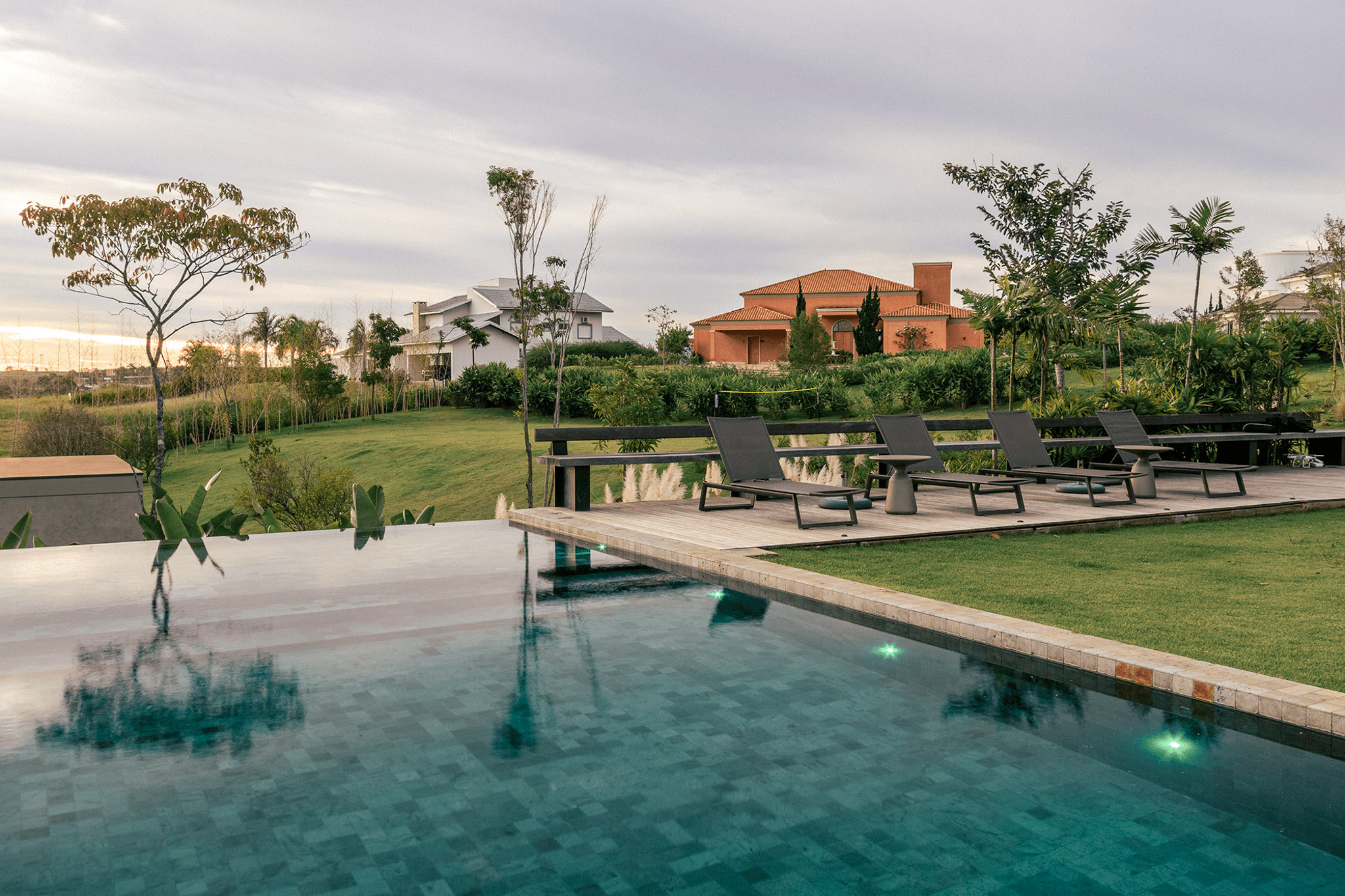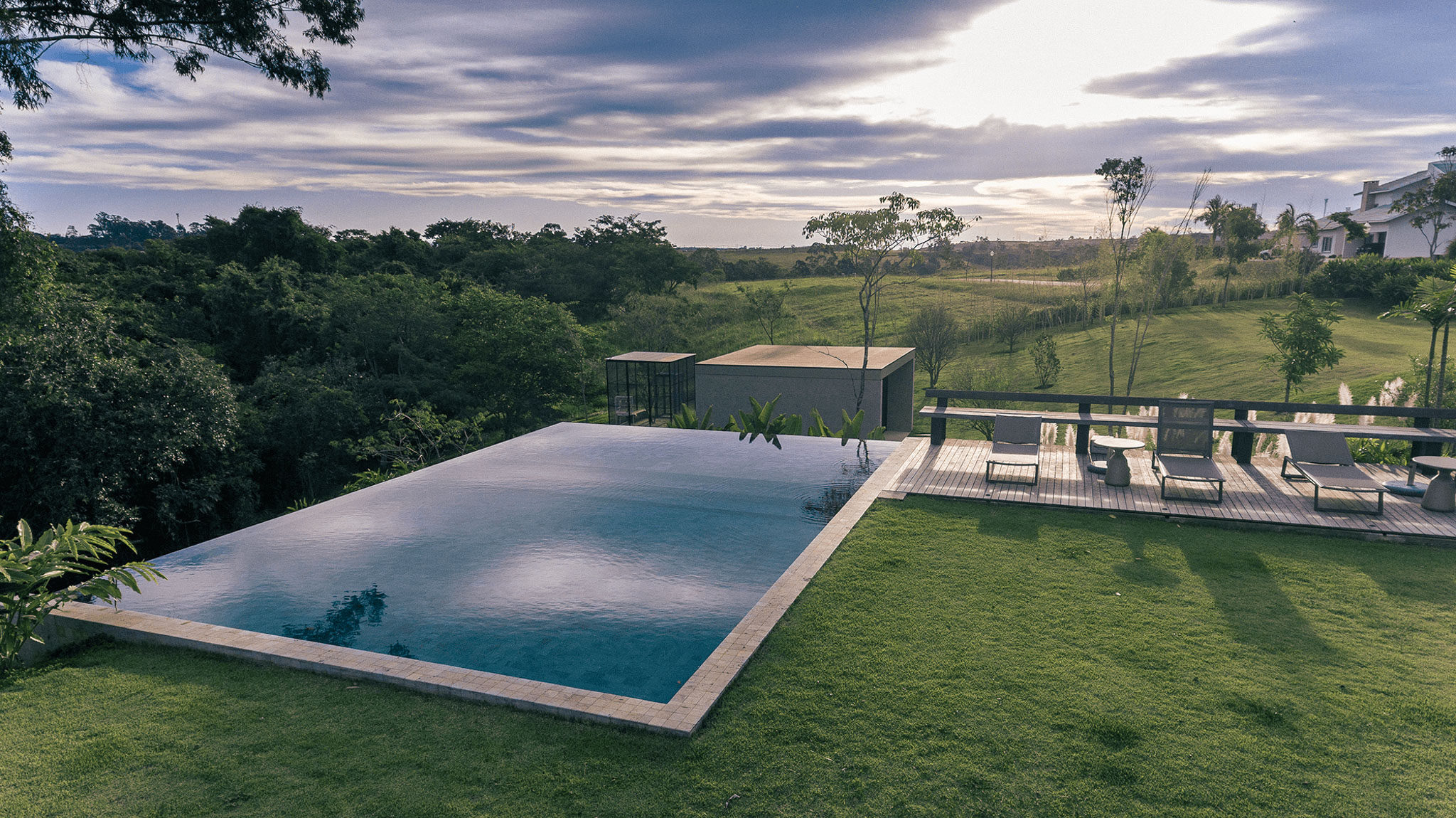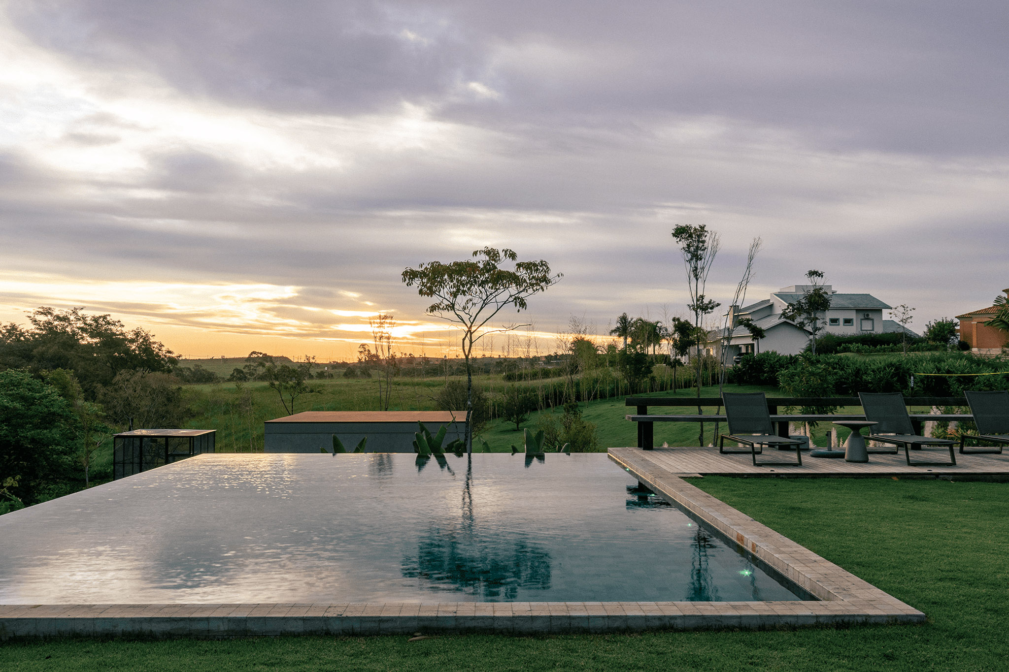 Neste projeto, no condomínio Terras de São José, a piscina se torna uma moldura do céu, transbordando para um infinito que a coloca como parte do horizonte presente na paisagem.
