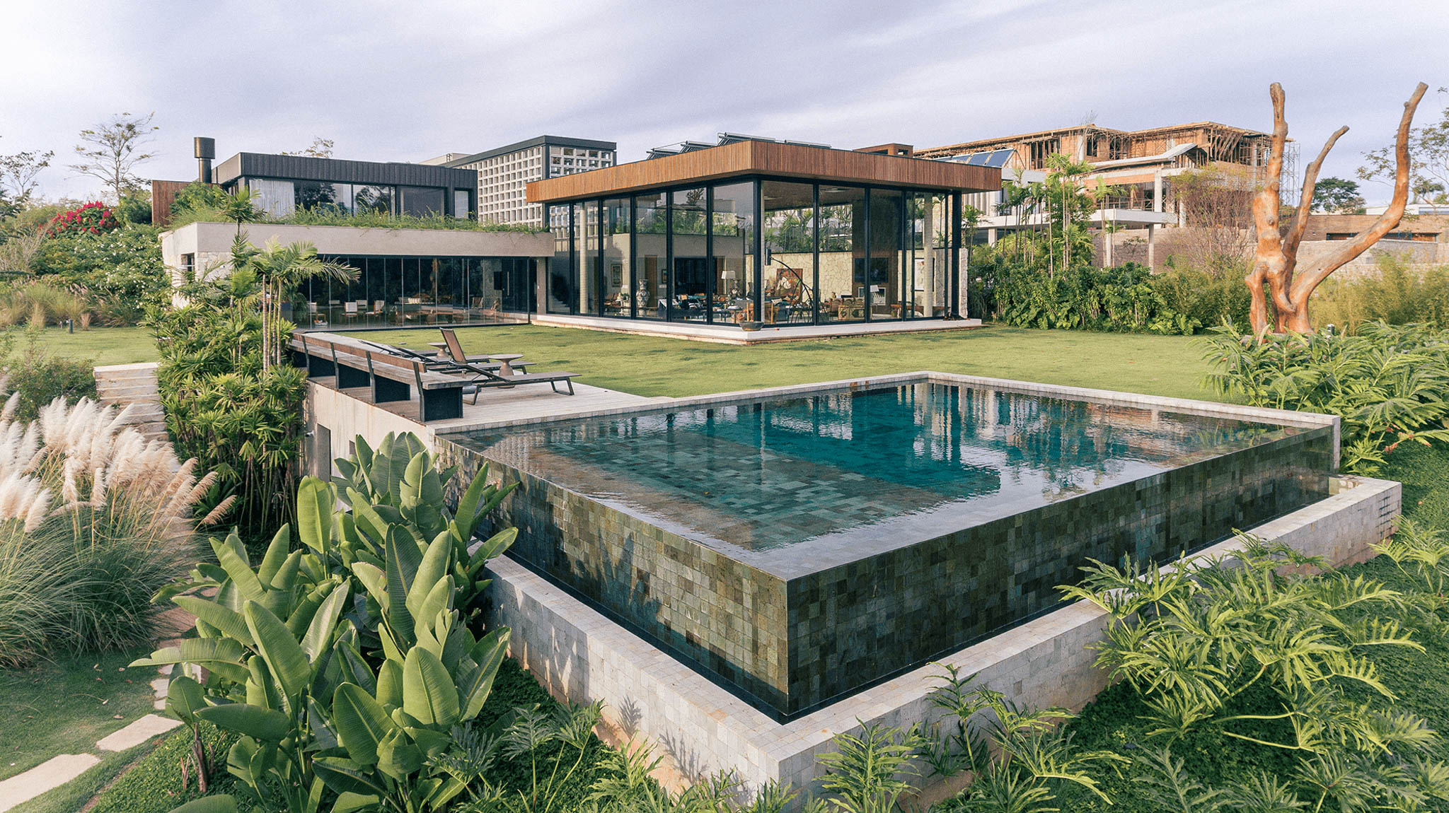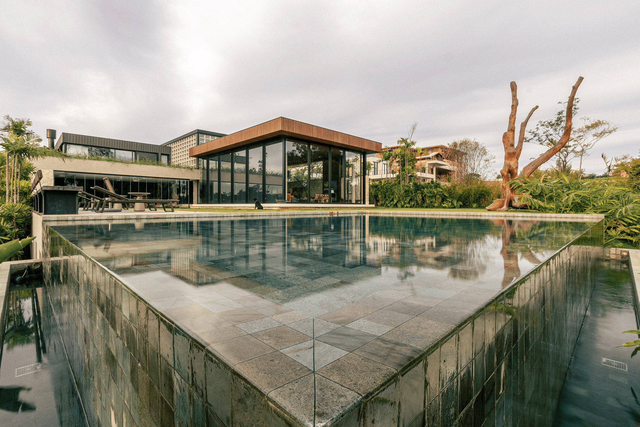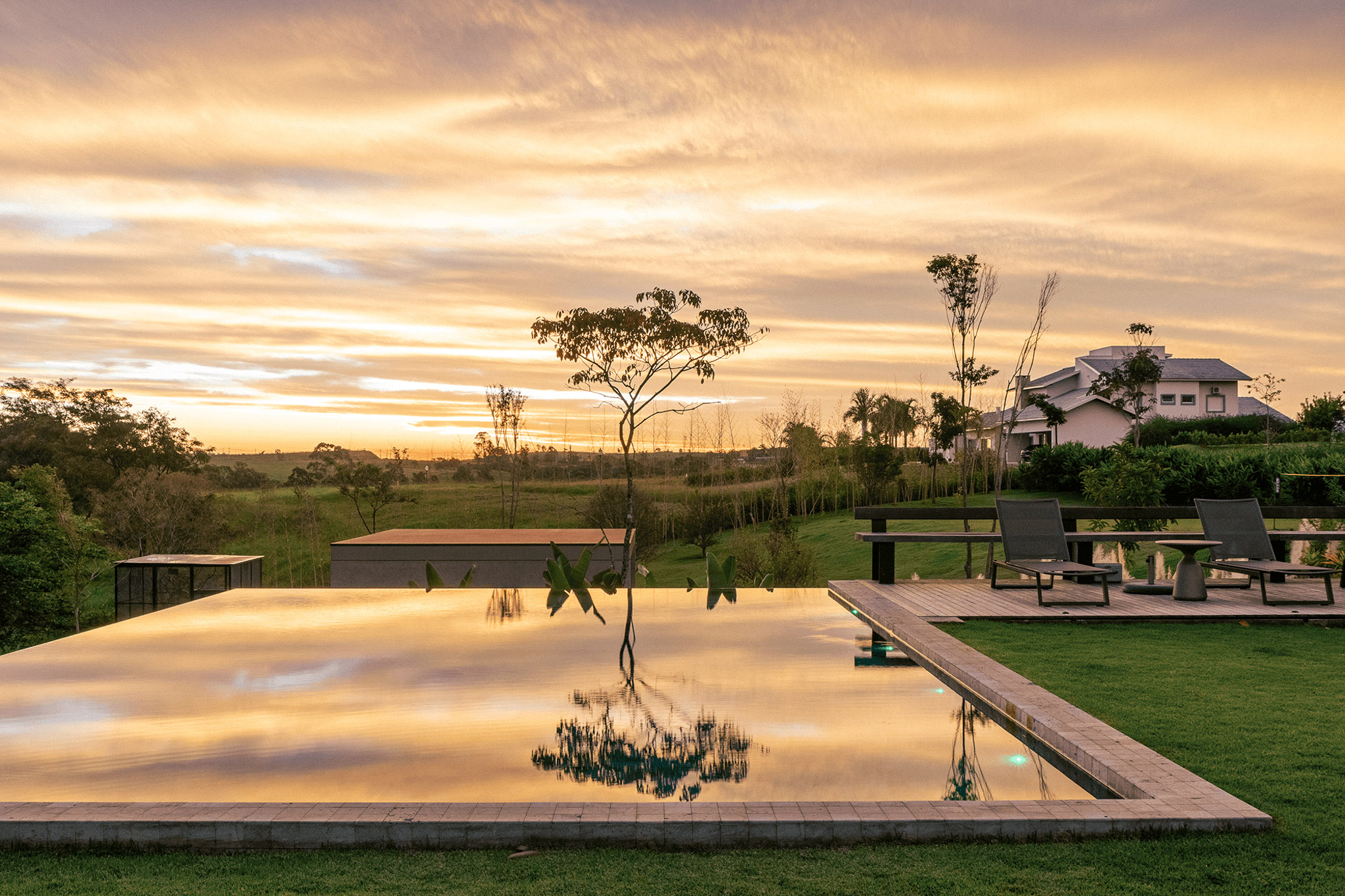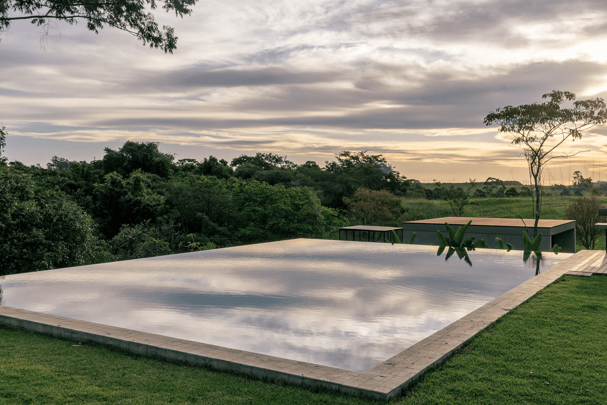 A piscina se torna uma moldura que reflete o céu e o verde predominante do local.