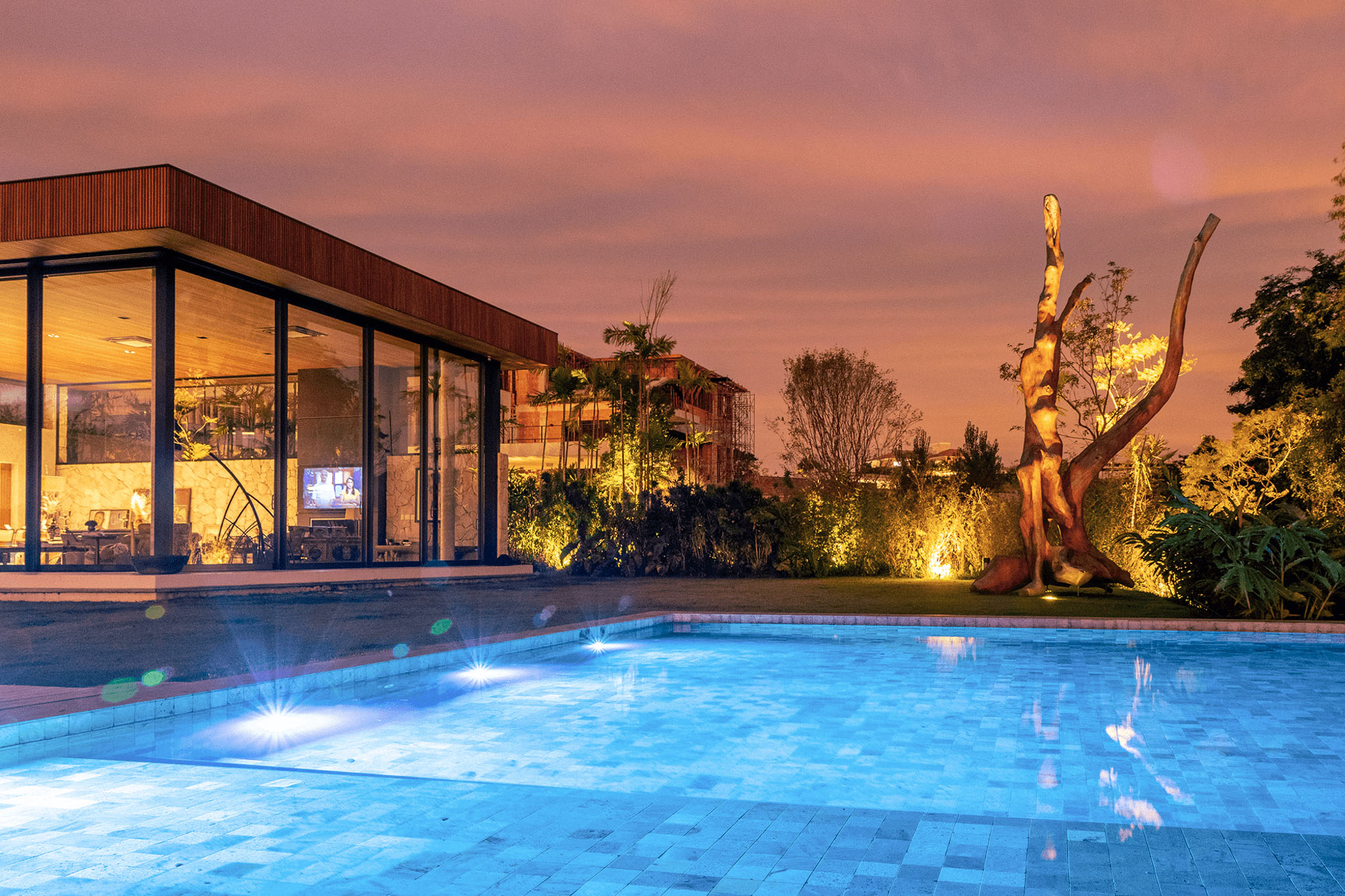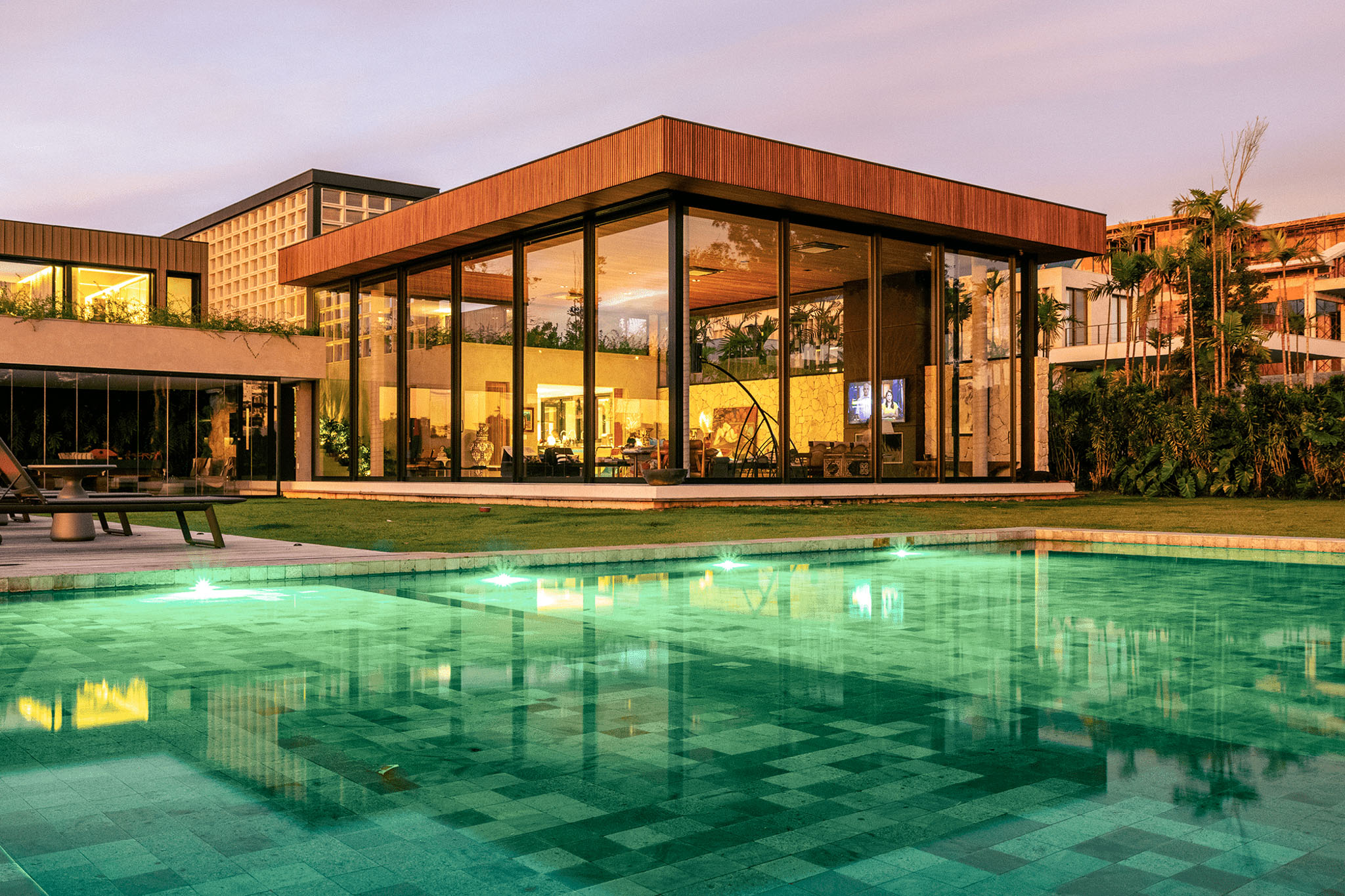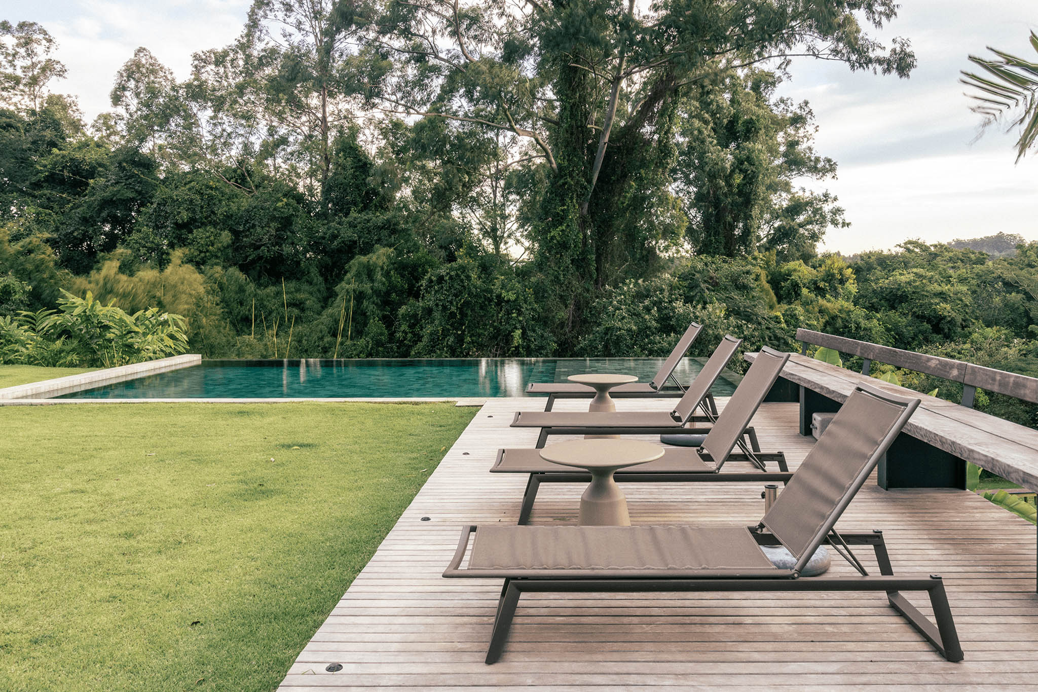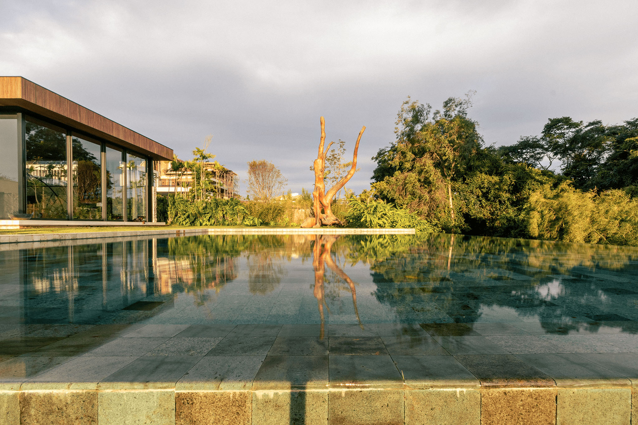 A piscina se torna uma moldura que reflete o céu e o verde predominante do local.